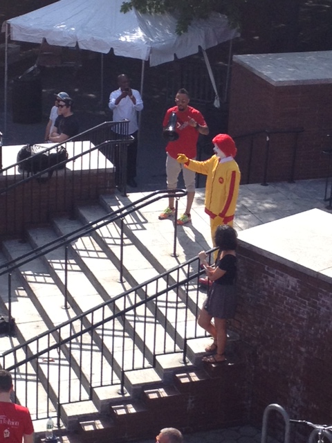 The guy playing Ronald McDonald, I learned, is actually training for a full marathon, and he did all sorts of athletic feats on stage before the run. He was also quite entertaining as he heckled the runners coming in to the finish line.